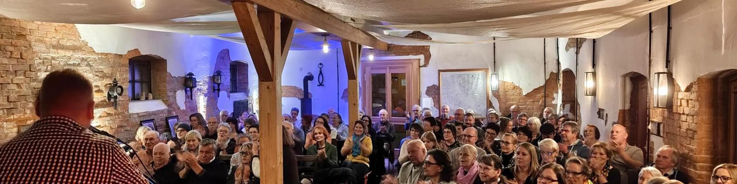 Jeder Wortbeitrag nach der Begrüßung des Vereinsvorsitzenden Klaus Röhr wurde musikalisch eingerahmt von Songs bevorzugt aus den 60er und 70er Jahren, gespielt vom Trio Herwig und Norbert Mollenhauser sowie Andre Hirschmann nebst launigen Moderationen des Raabenhorst-Machers. So schaukelte sich die Stimmung auf, das zahlreiche Publikum – 100 Stühle reichten nicht aus, 20 Gäste mussten stehen – ging fantastisch mit, Lesende und Musizierende wurden immer besser, sodass das Abendprogramm erst nach mehr als drei Stunden ausklang – eine wahrlich denkwürdige Veranstaltung an einem überaus sehenswerten Ort.